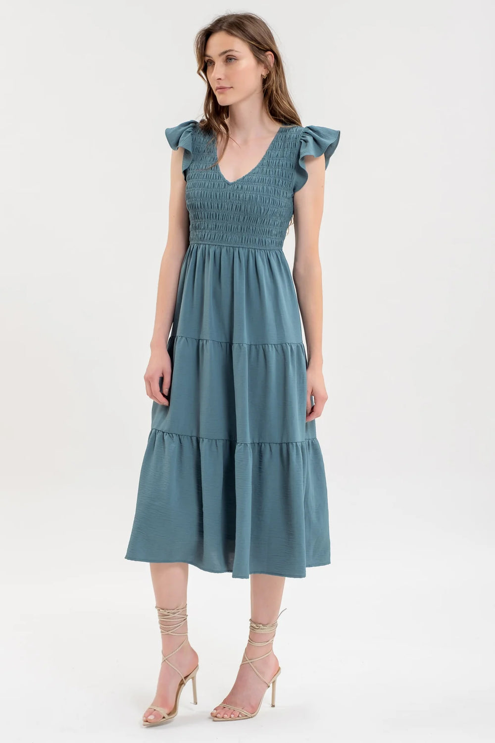 Crafted with sweet simplicity, this dress features a V-neckline, a smocked bodice, short flutter sleeves and a tiered midi length skirt.