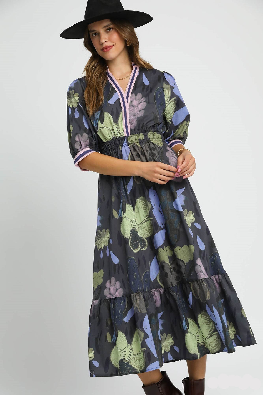 Our Contrast Band Floral Dress is a midi dress with beautiful abstract floral prints and contrast band details.