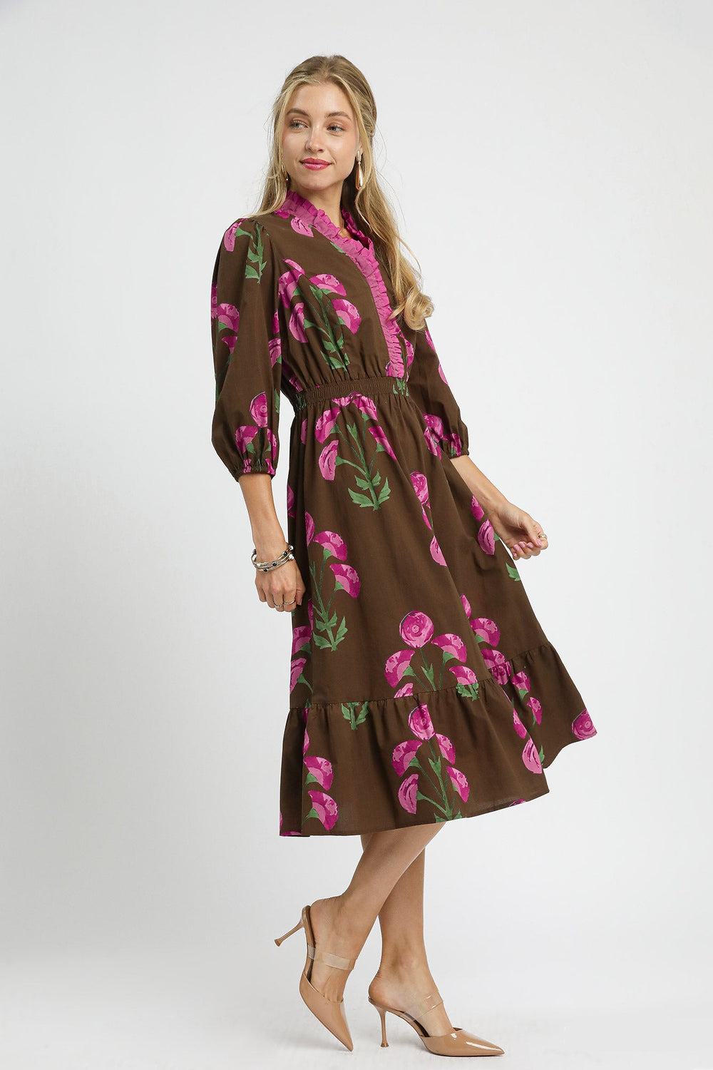 It features a V neckline with a bold contrasting ruffle trim, 3/4 sleeve balloon sleeves, elasticized waist and a tiered midi length skirt.