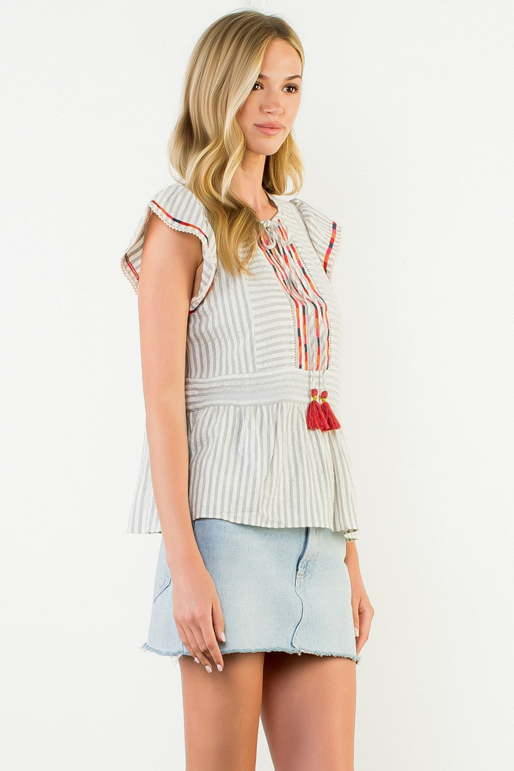Our Striped Top With Tassels is a comfortable and unique top that will pair so easily with any denim bottoms, slacks or flowy pants.