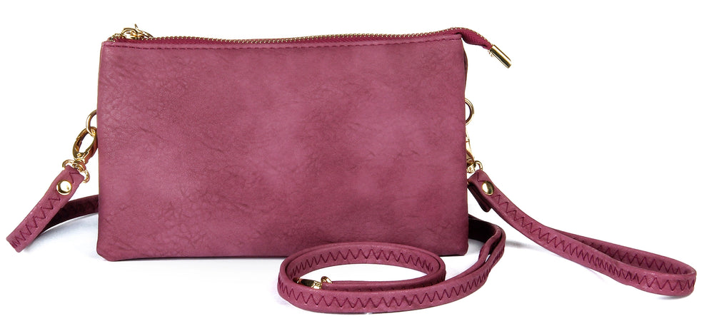 Made of supple vegan leather material and it can be carried 3 ways: as a clutch, on the detachable wristlet, or with the adjustable crossbody strap!