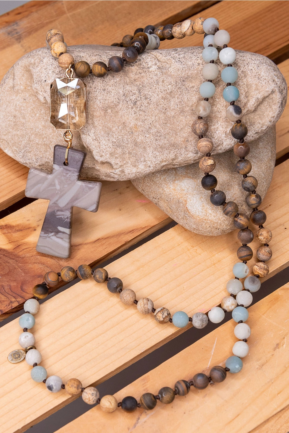 Natural stone beads with amazonite creating a unique piece along with a a gorgeous cross pendant below.