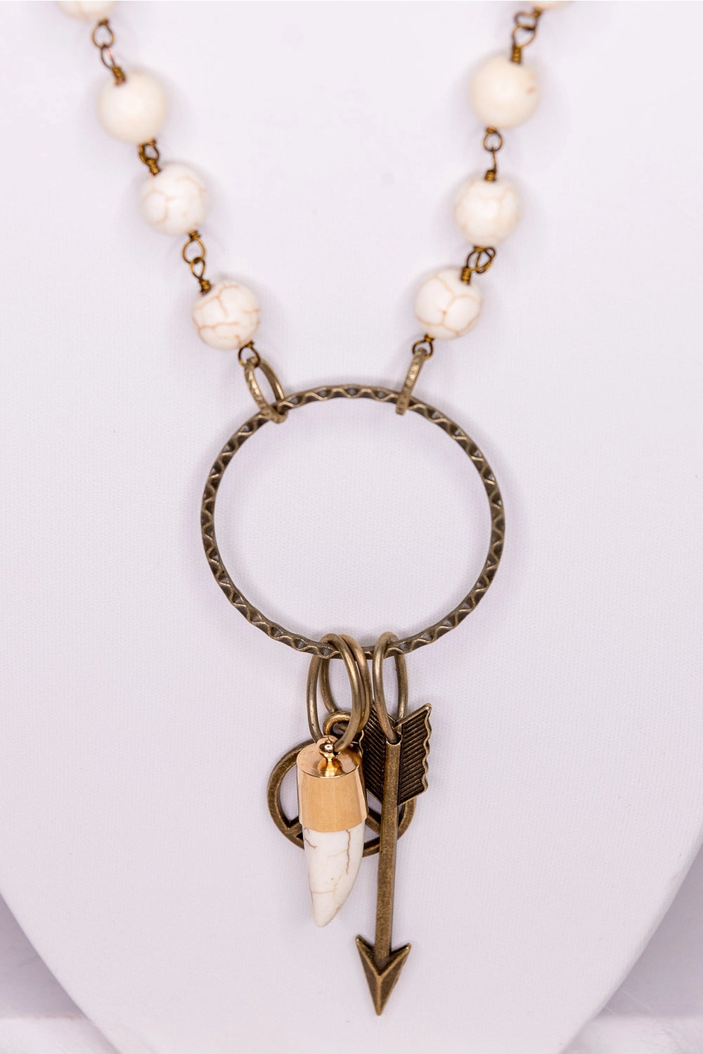 Features a metal bronze ring with an arrow charm, a peace sign charm and a white wolf tooth charm.