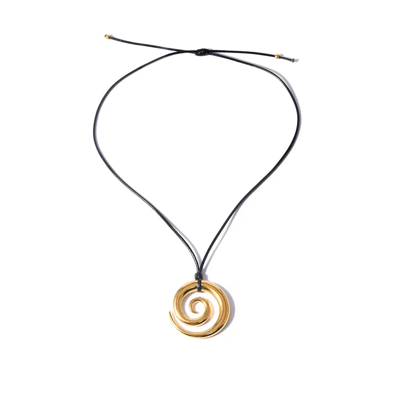 Statement sized spiral disc in a shiny gold tone, on a black wax rope.