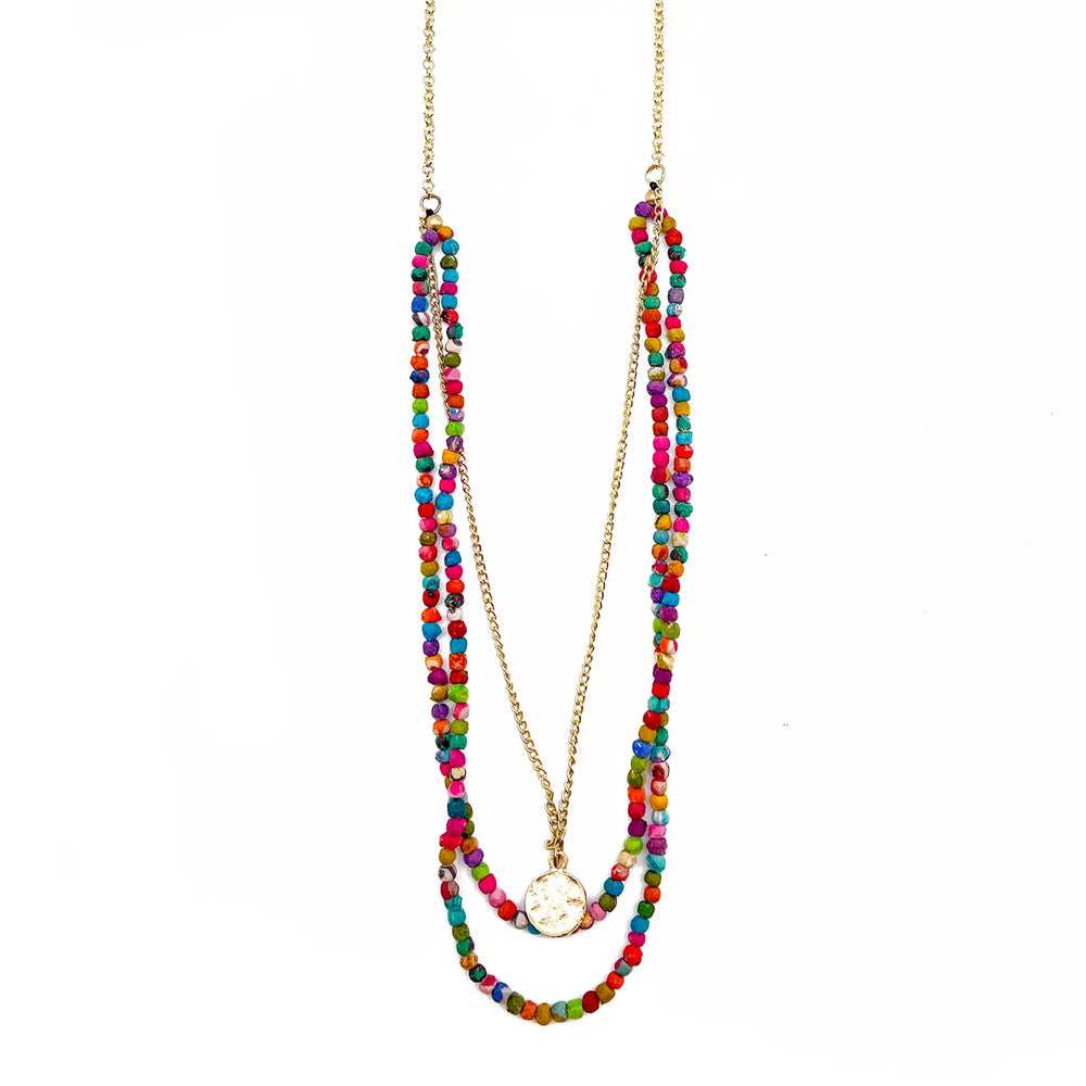 Colorful handcrafted necklace made with small wooden beads wrapped with recycled sari fabrics.