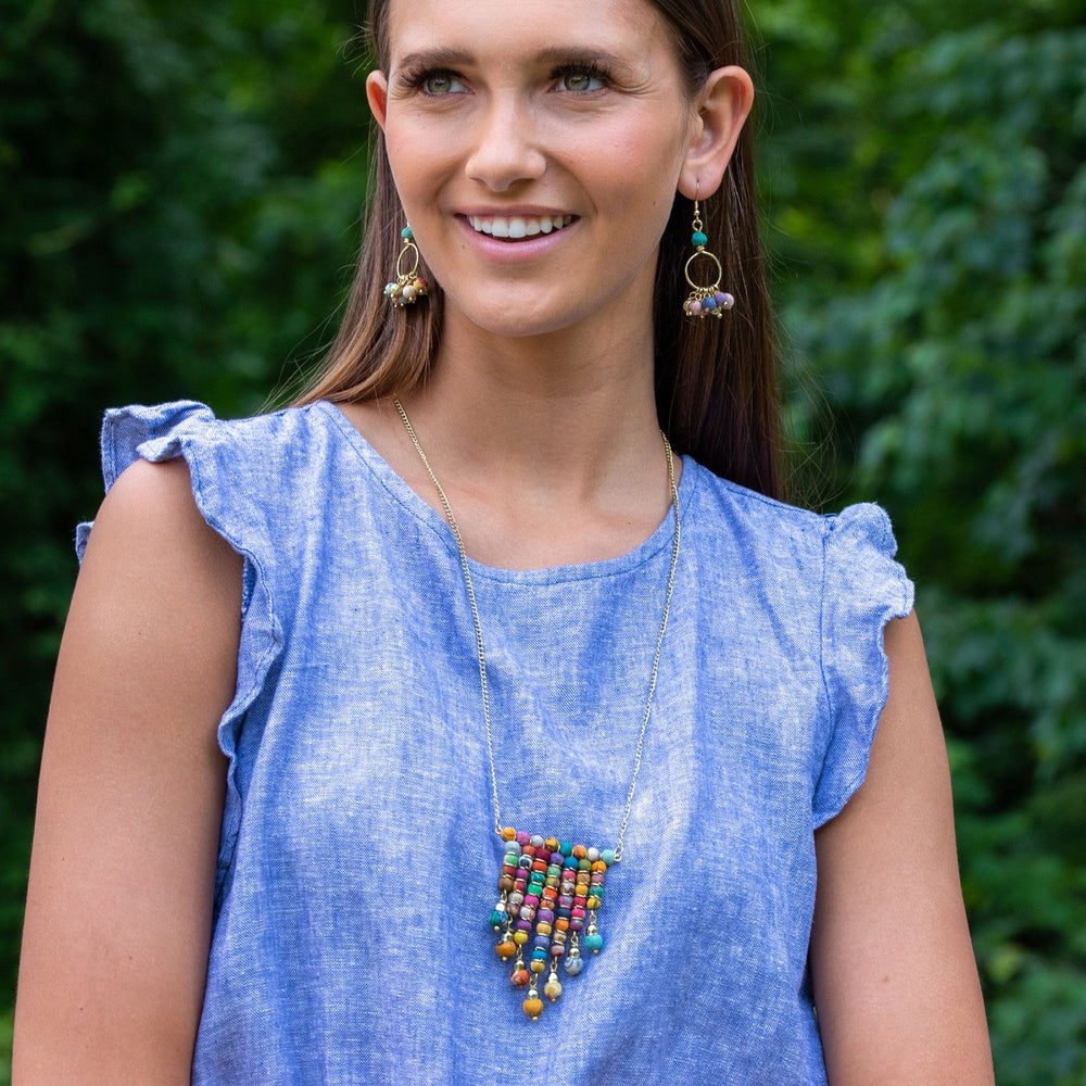 Colorful handcrafted necklace made with small wooden beads wrapped with recycled sari fabrics.