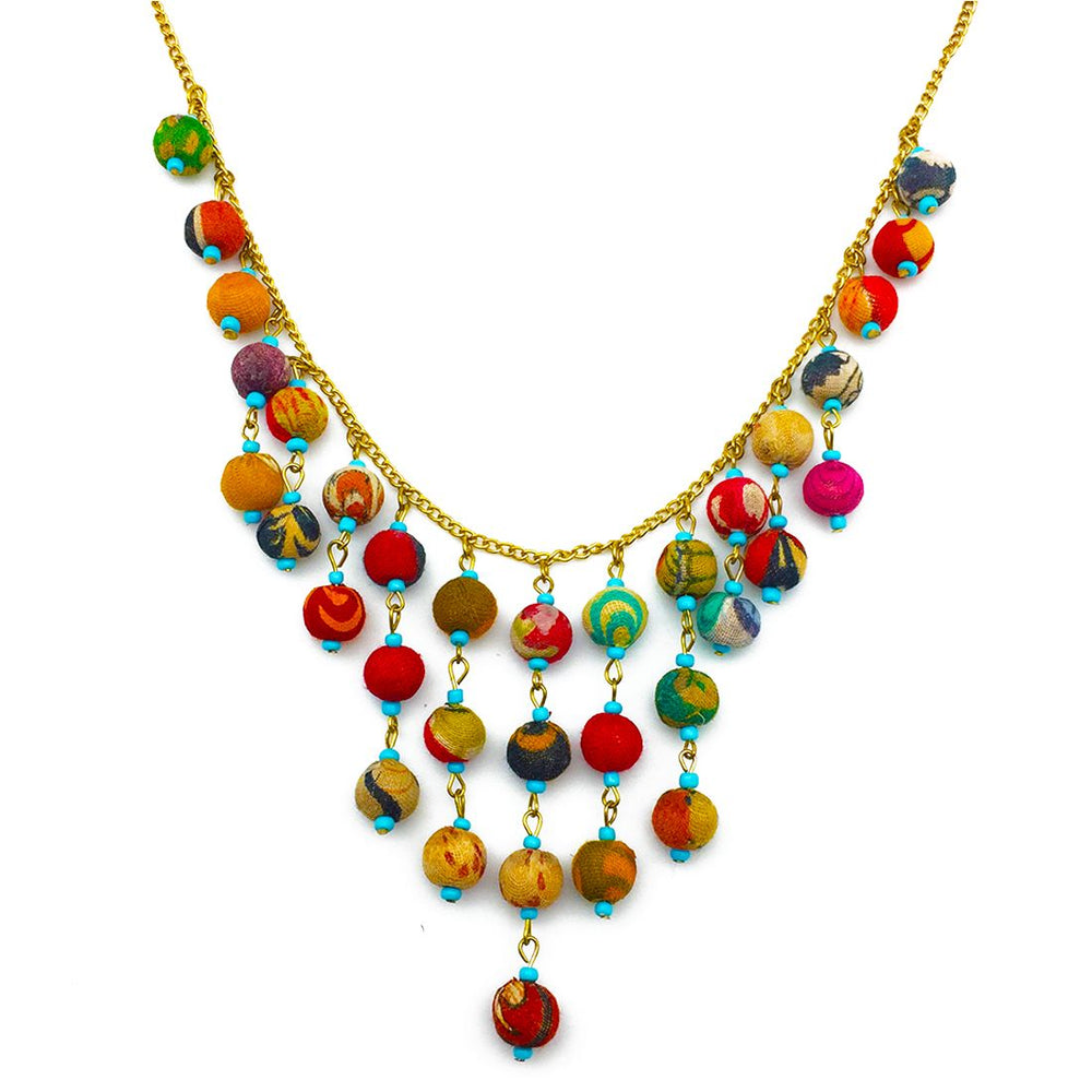 Colorful handcrafted necklace made with wooden beads wrapped with recycled sari fabrics.