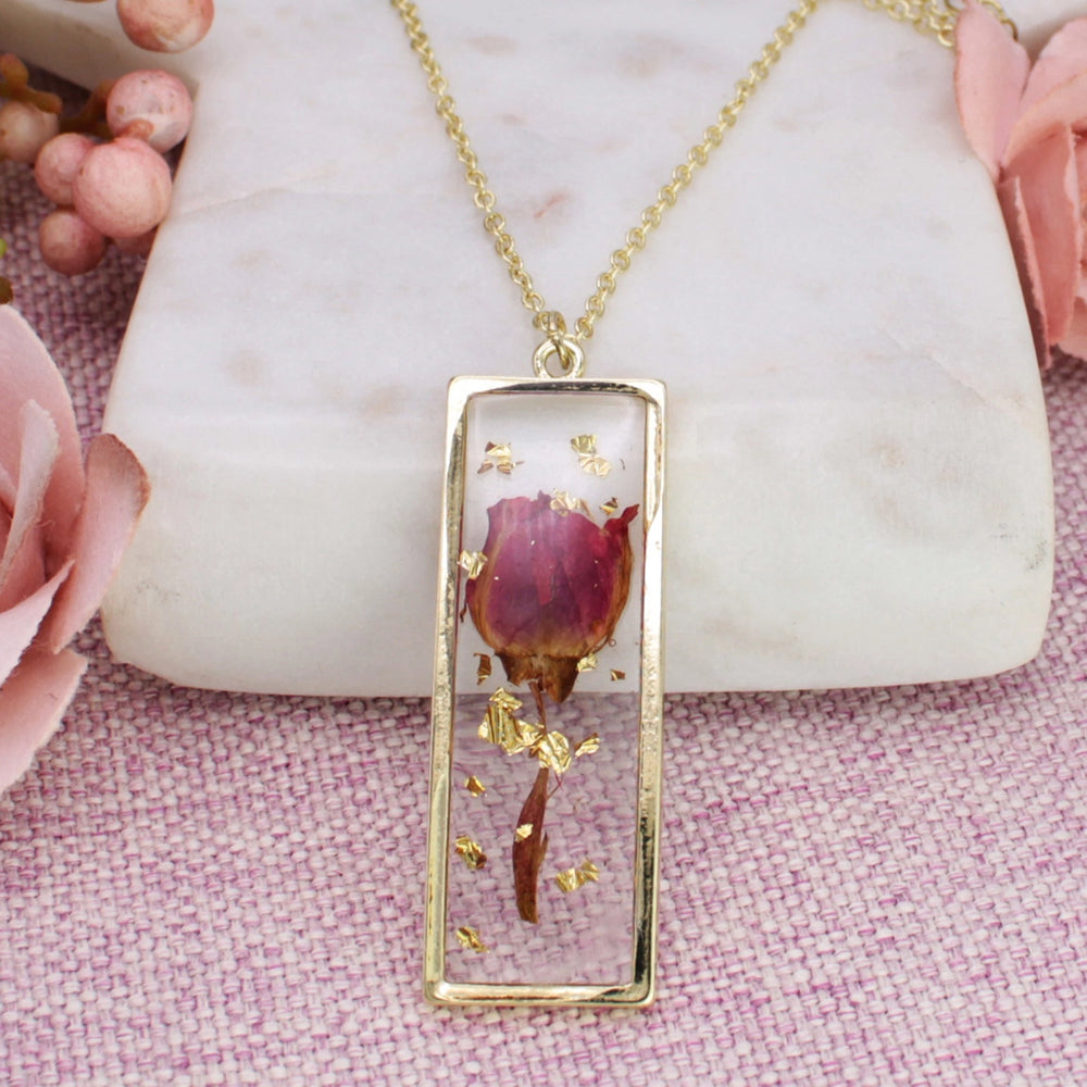 Infuse nature into your style with our Gold Bar + Red Dried Flower Necklace.