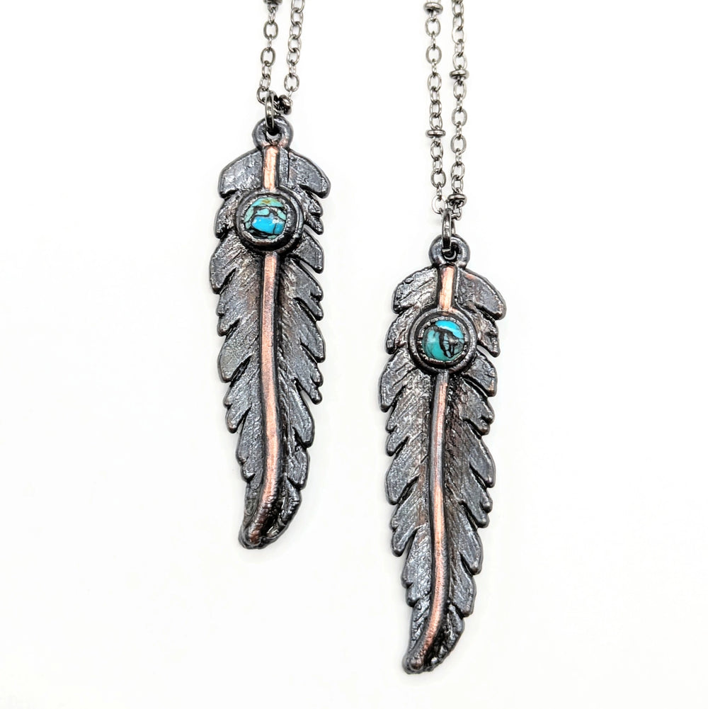 One copper electroformed Gunmetal Feather Pendant with Turquoise on a 20" soldered gunmetal chain.