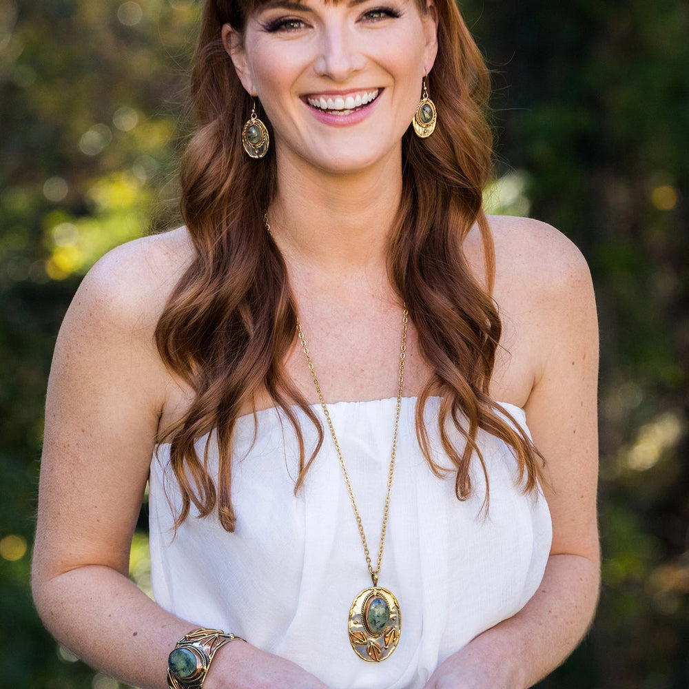 These Janya Pendants are made of mixed metals: brass and copper with a gorgeous semi precious stone.