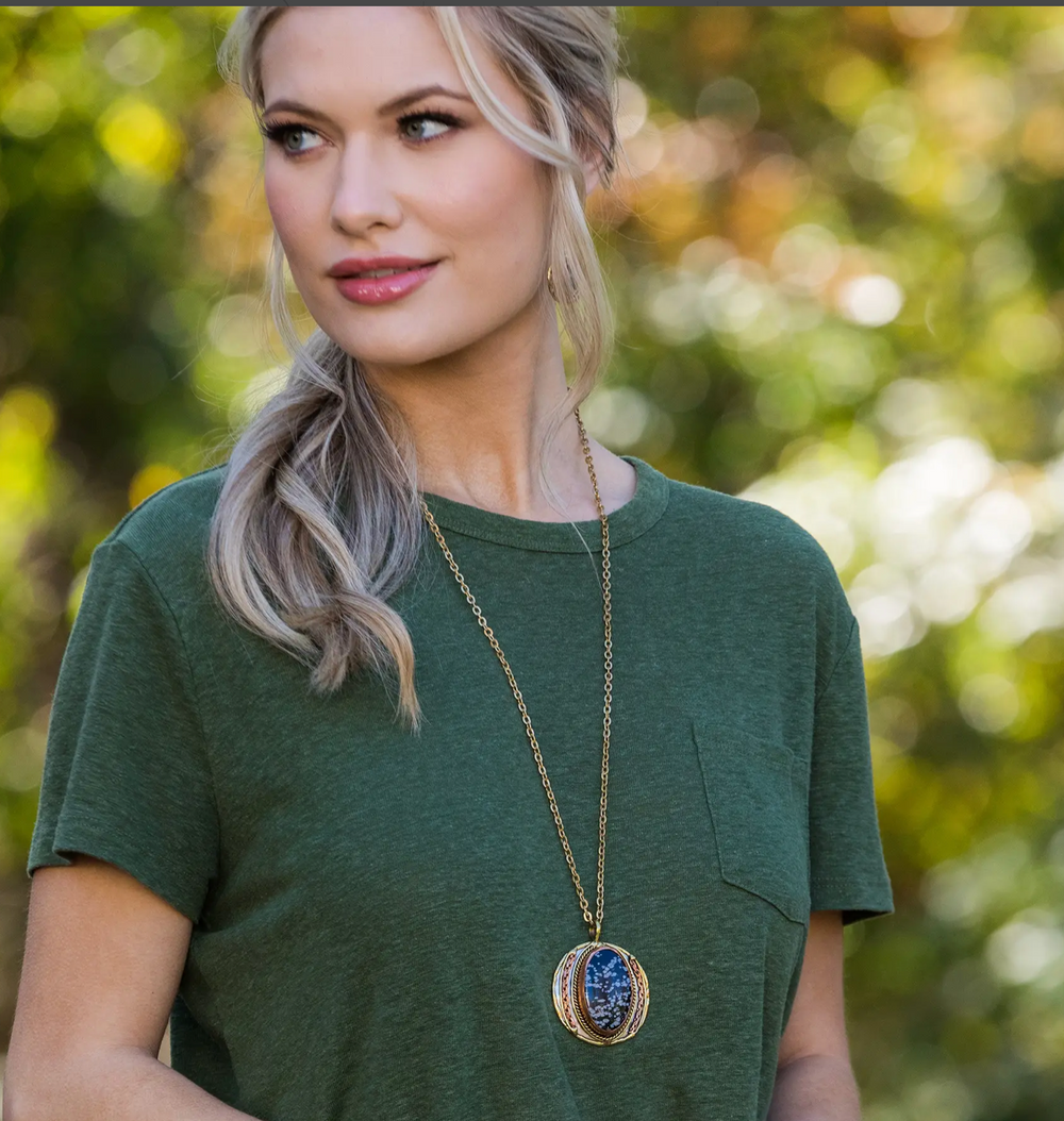 These Janya Pendants are made of mixed metals: brass and copper with a gorgeous semi precious stone.