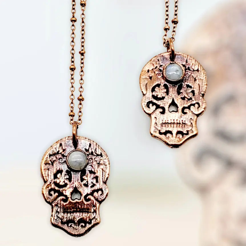 One copper electroformed Rainbow Moonstone adorned Sugar Skull complete on an 18" soldered copper chain.