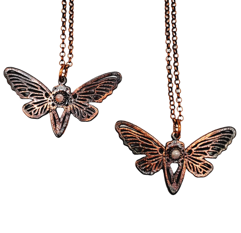 One copper electroformed Rainbow Moonstone Cicada on an 18" copper chain.