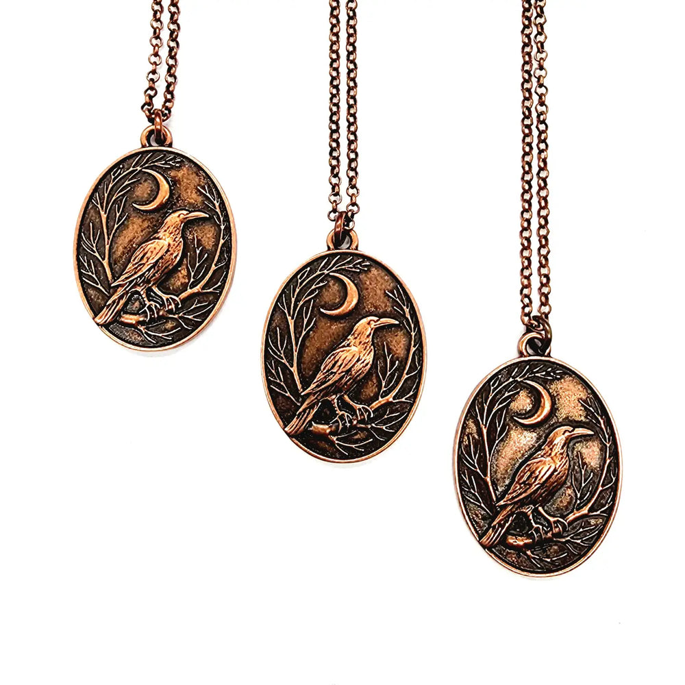This antique-inspired copper pendant features a beautifully detailed raven perched beneath a crescent moon, encircled by delicate branches.