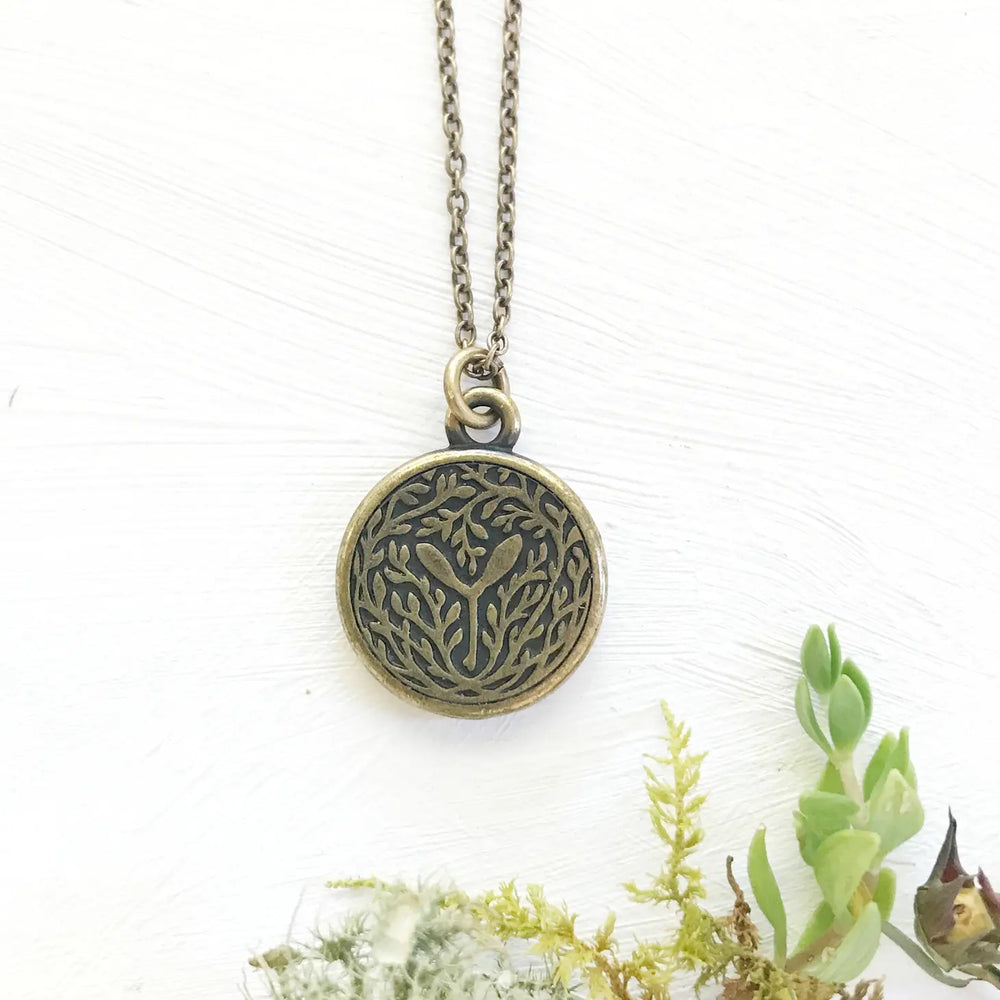 The pendant is high quality, USA made with a brass oxide finish. 3/4" diameter.