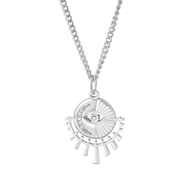 This ornate disc pendant has a laser cut sunburst and evil eye design and shiny crystal inlays in a crescent moon.