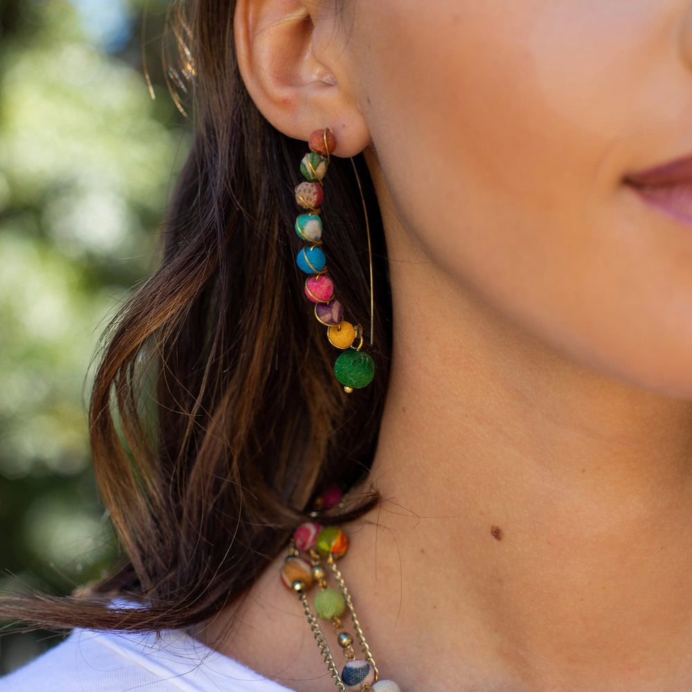 Colorful earrings made with wooden beads wrapped with recycled sari fabrics.