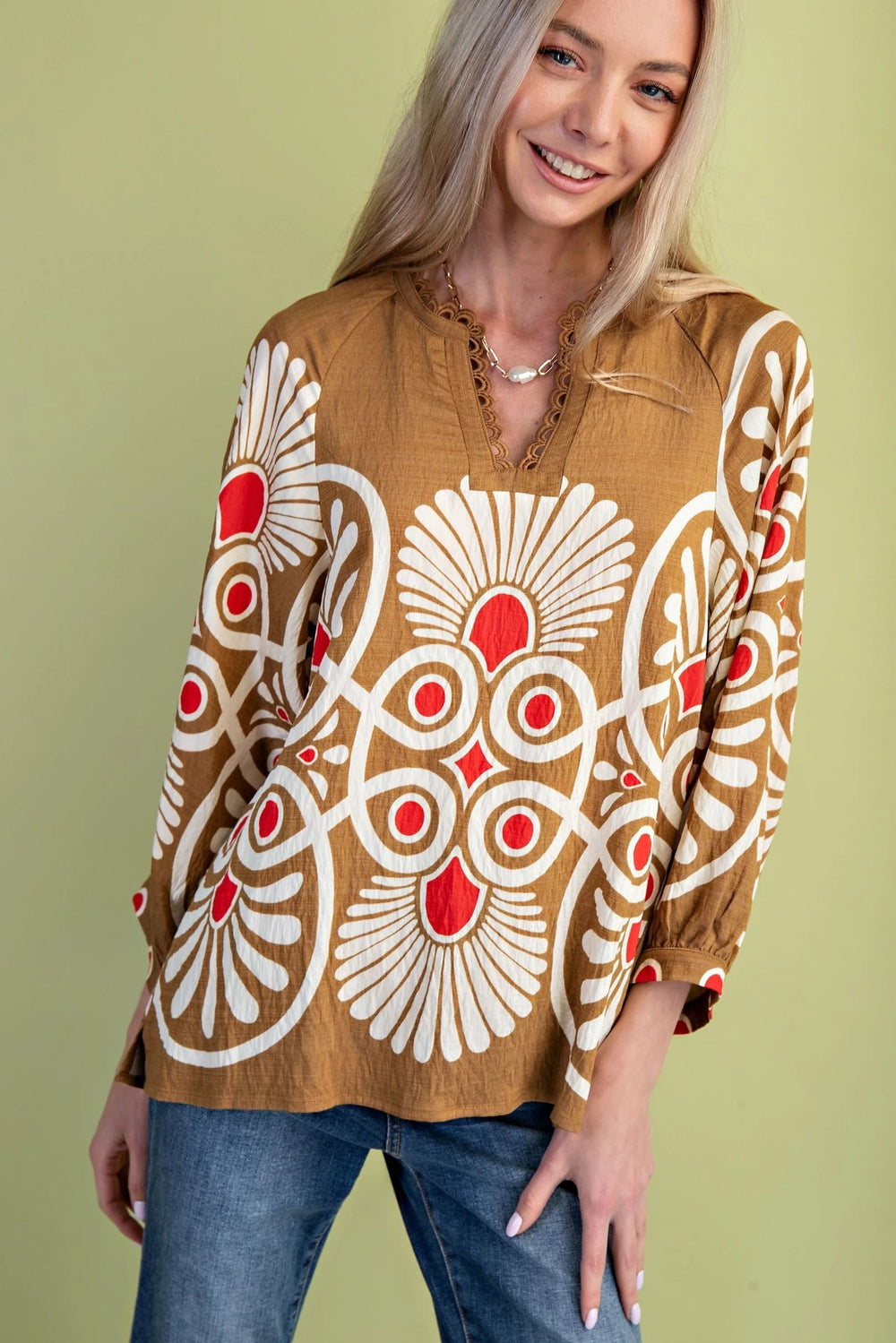 Designed with a flowy fit and a warm-toned tribal inspired print, this notch neck top is an effortlessly chic favorite.