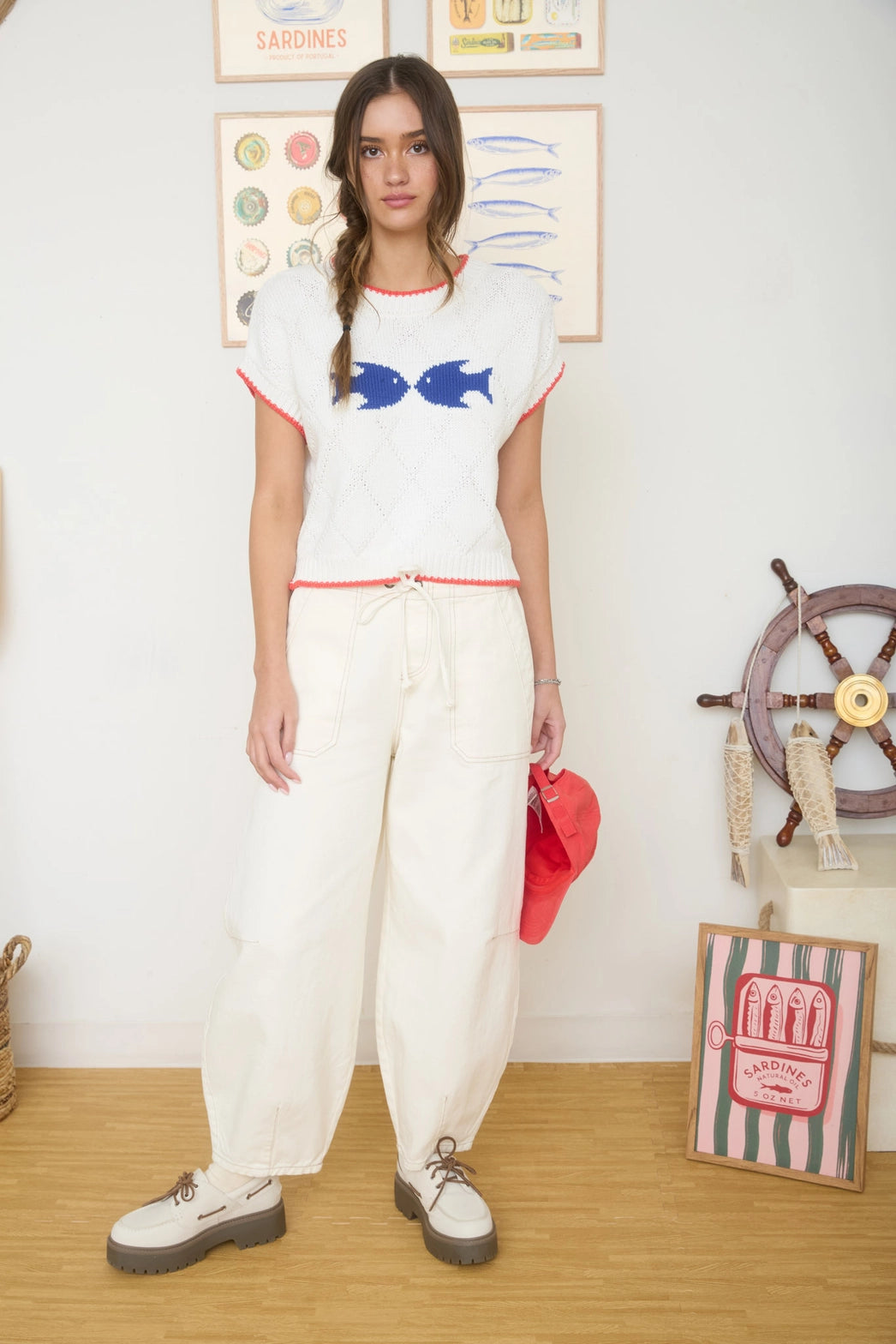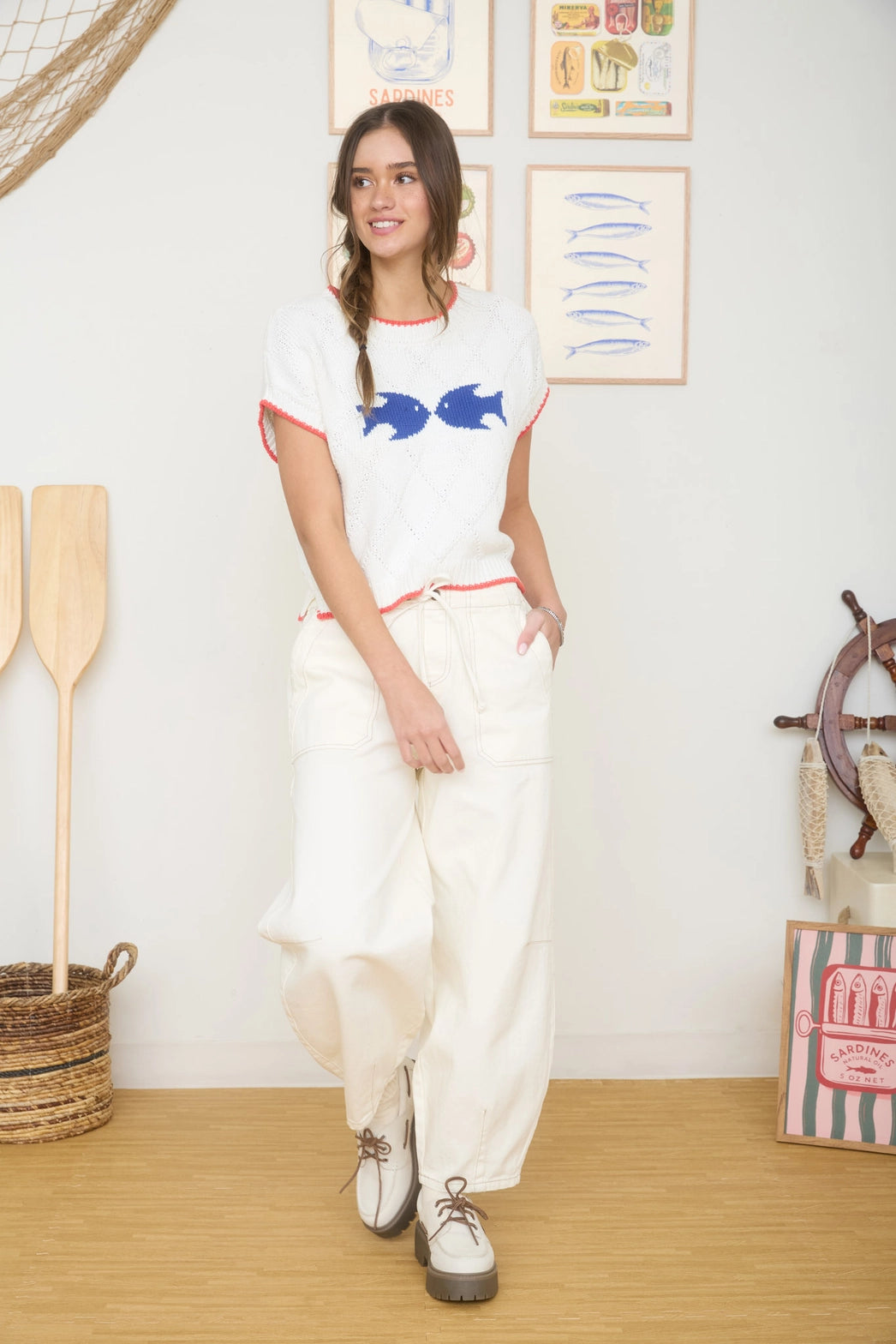 Contrast trim short sleeve sweater featuring a classic coastal colors with a bold fish outline and matching hem stitch on the round neckline and cuffs.