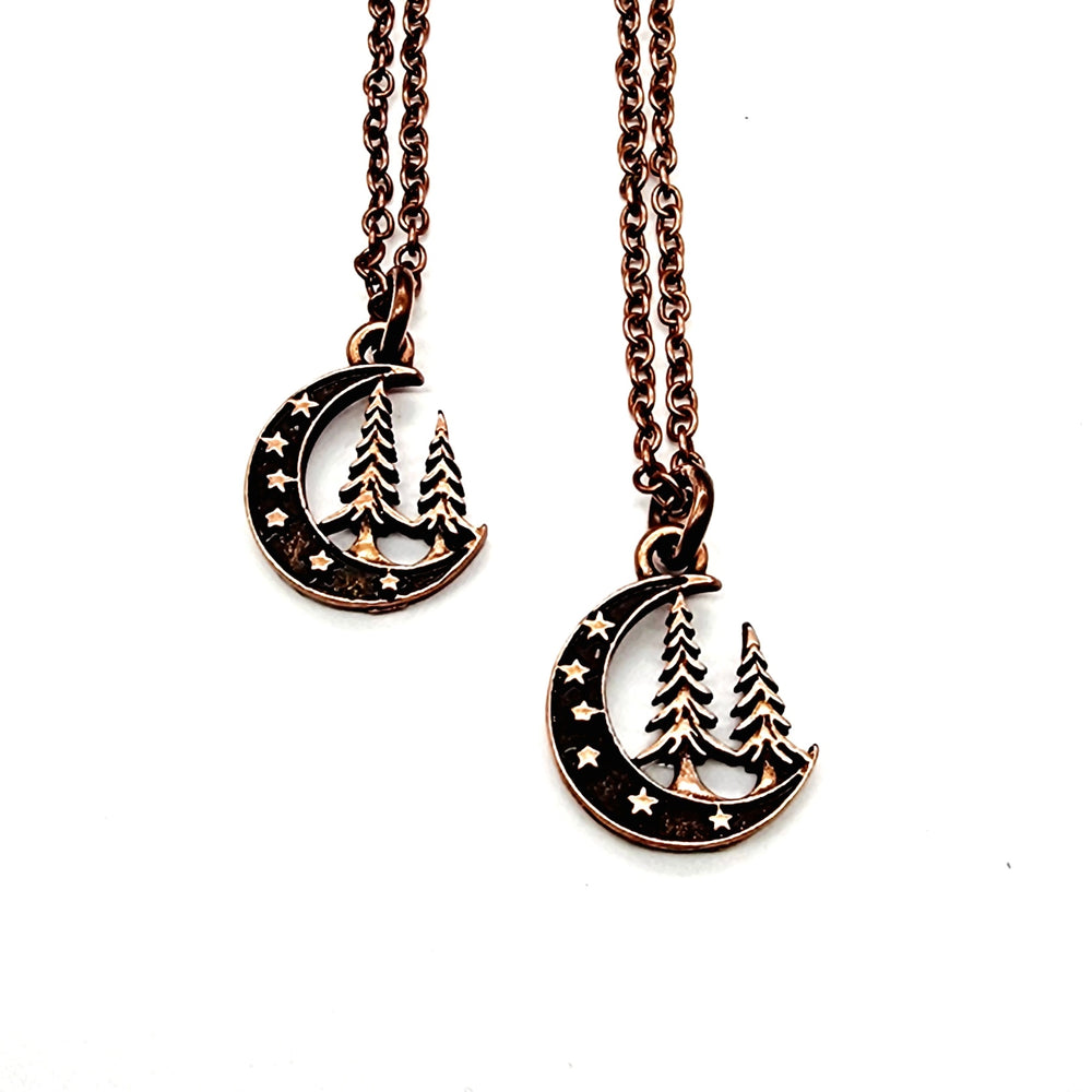 Wander into the quiet stillness of the forest beneath a star-filled sky with our Midnight Pines Necklace. This enchanting pendant features a crescent moon cradling two tall pine trees surrounded by scattered stars — a tribute to wild places and quiet nights under the cosmos.