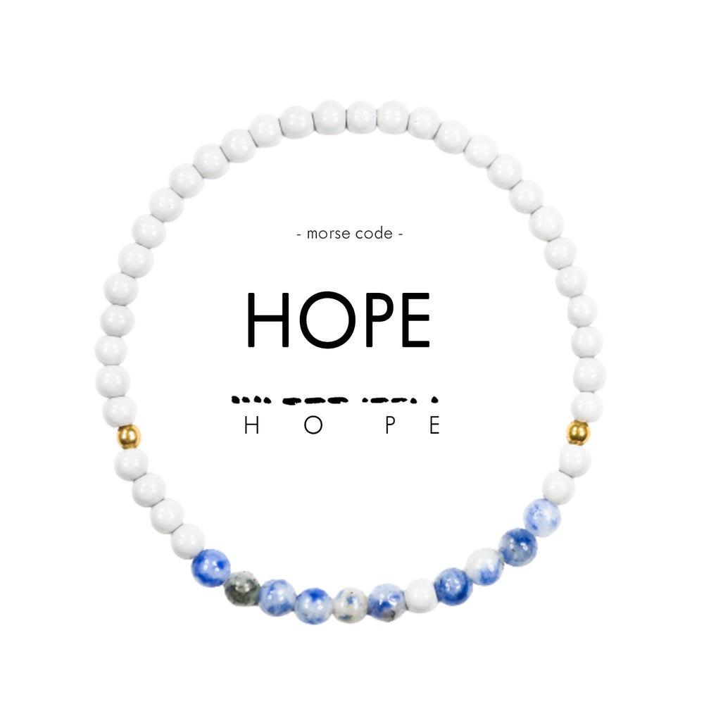 How to read your jewelry: A Morse Code dot is one bead and a dash is two beads in the alternating color. Start at the small gold spacer bead and follow the Morse Code spelling around the bracelet!