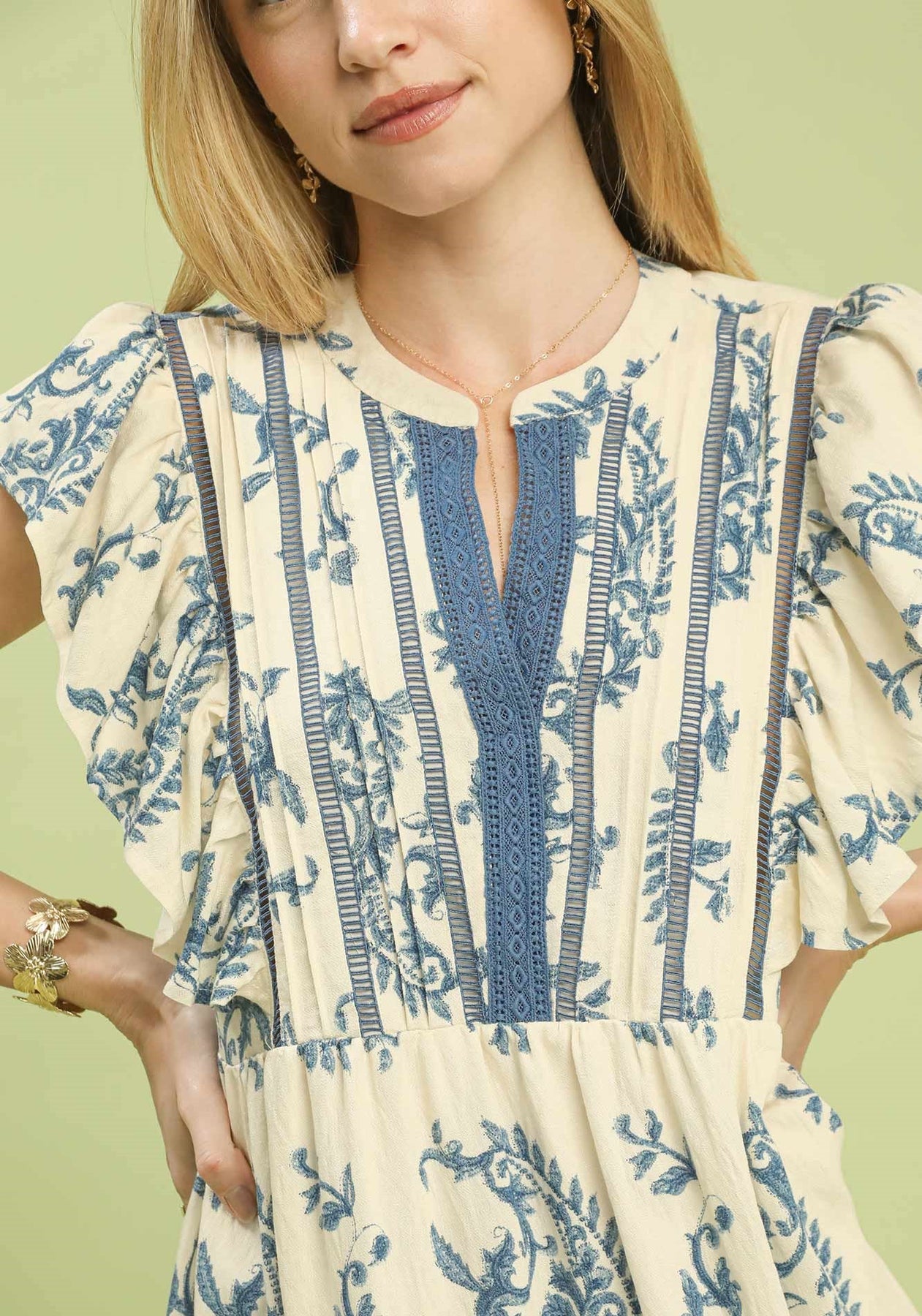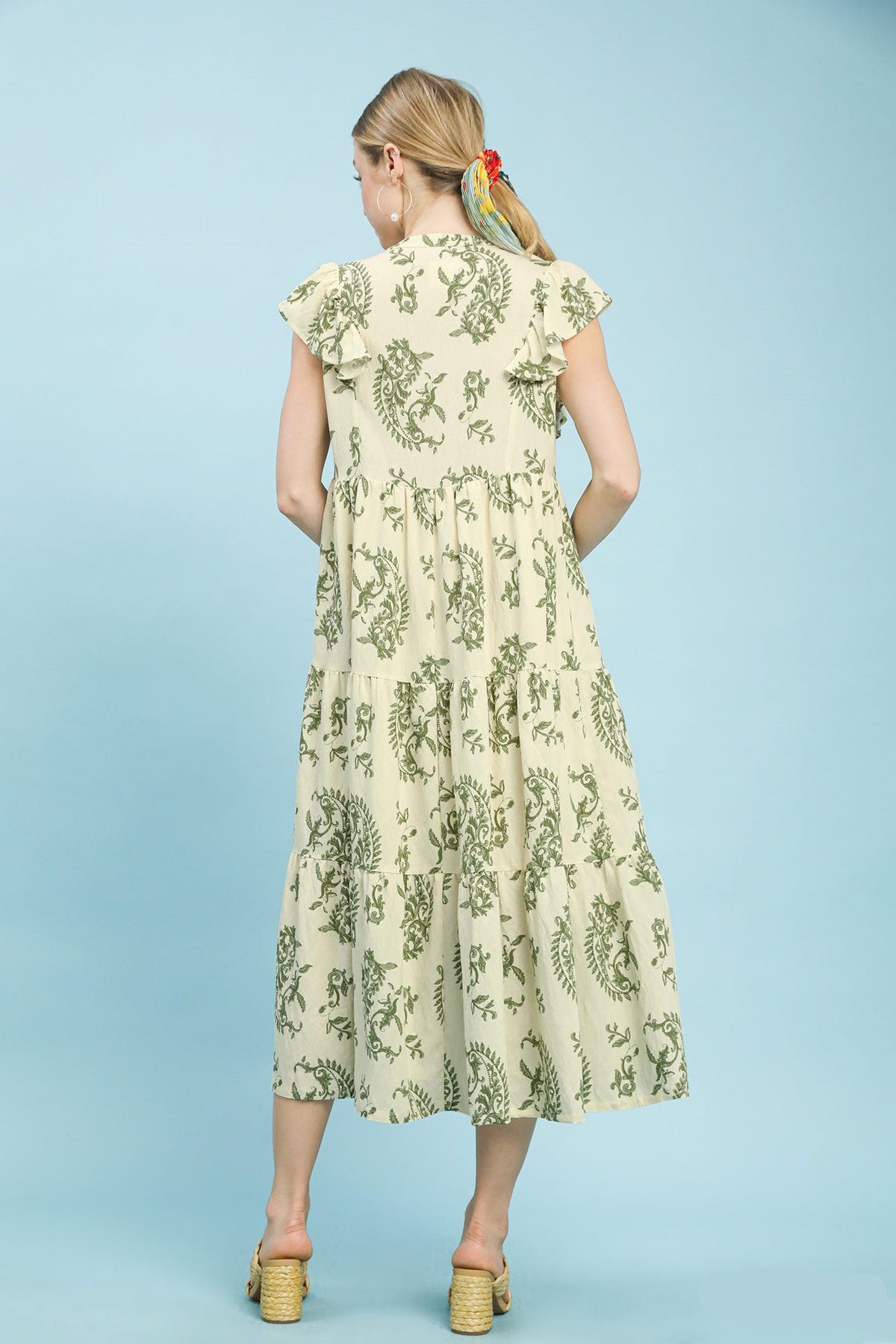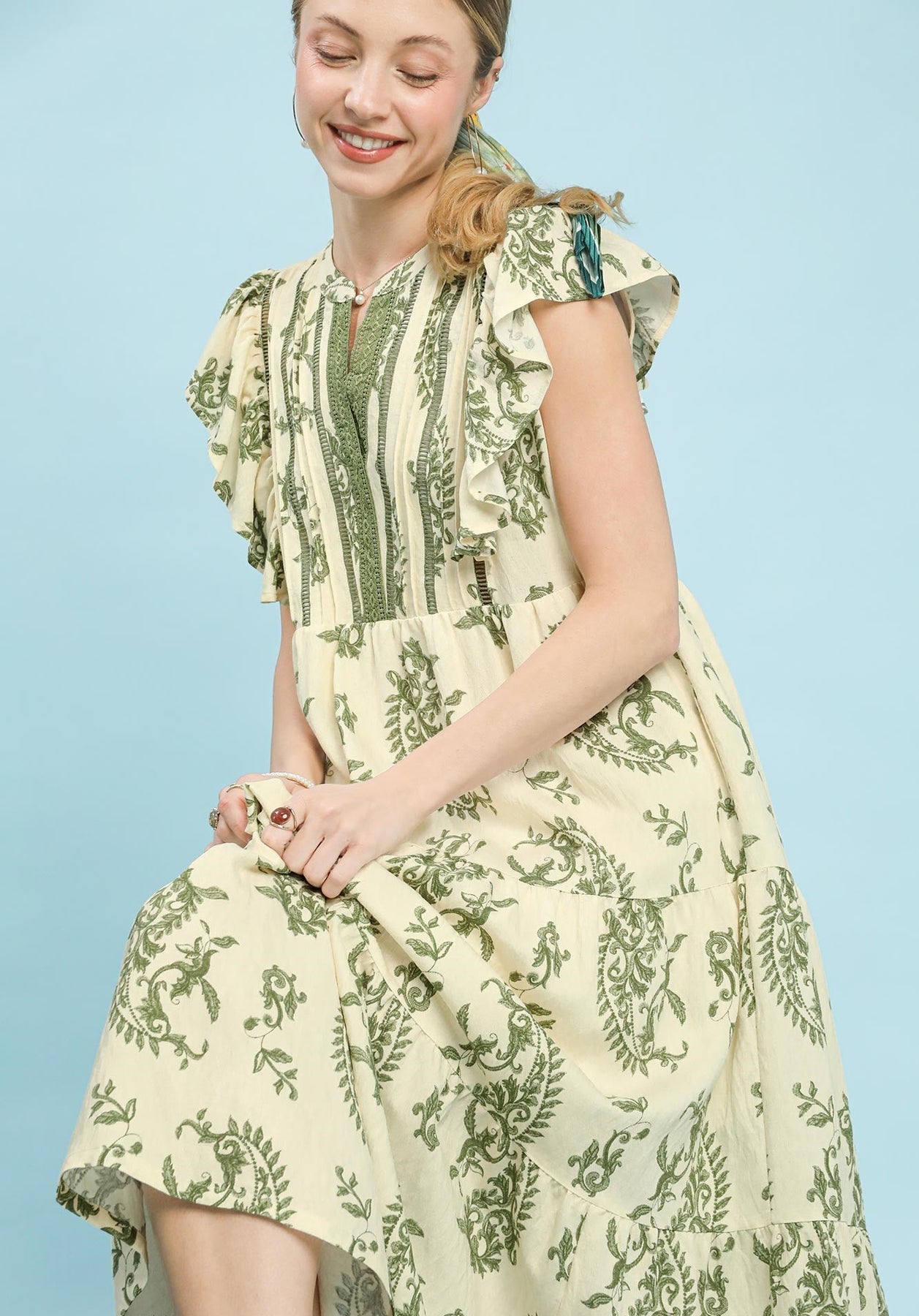 This paisley print midi dress with ruffle flutter sleeves, lace trim details, and a tiered bodice.