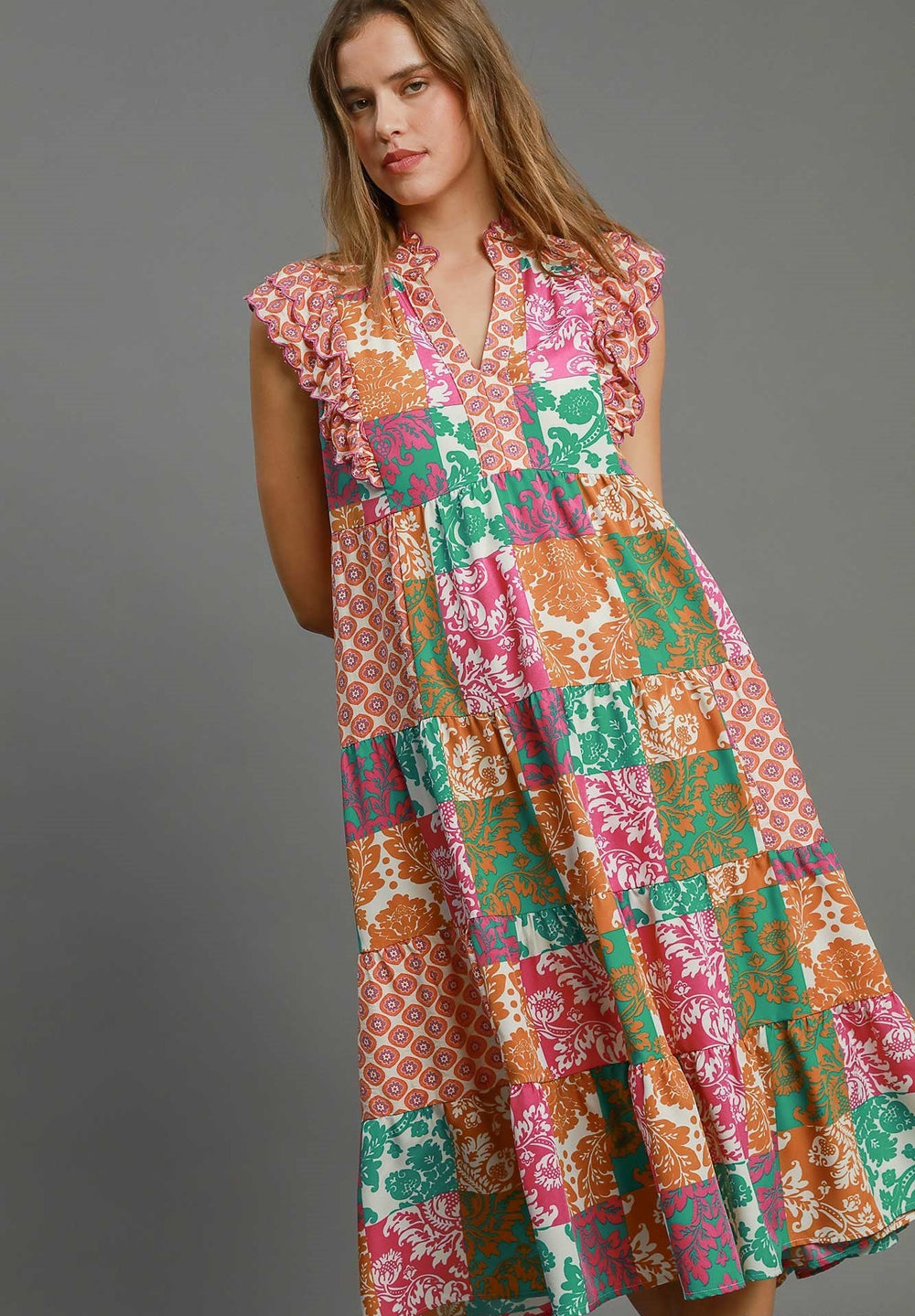 Patchwork printed midi dress in tones of pink, orange and greens.