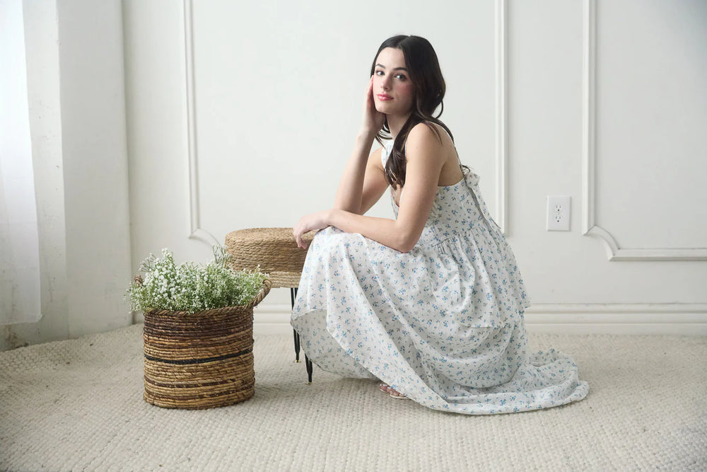 The ruffle tiers add a playful touch to the light blue floral pattern.