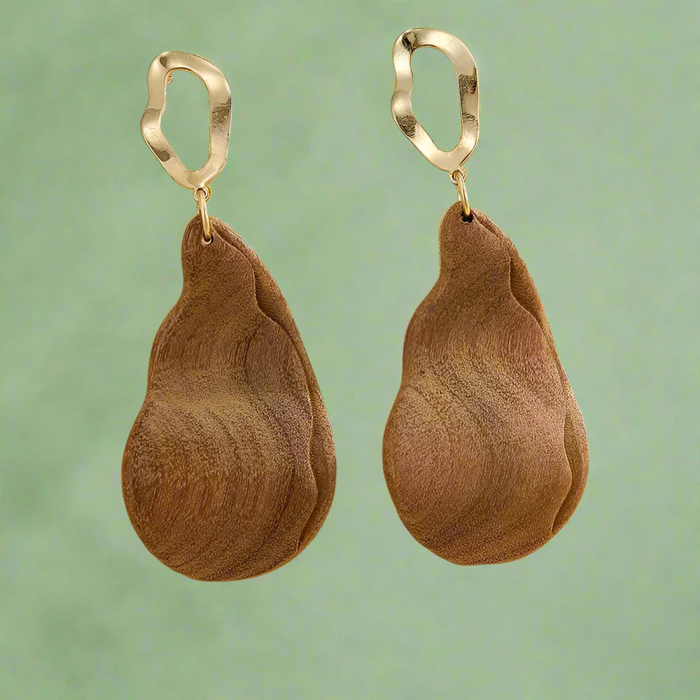 Wood design earrings dangling under a gold tone design stud or French ear wire.
