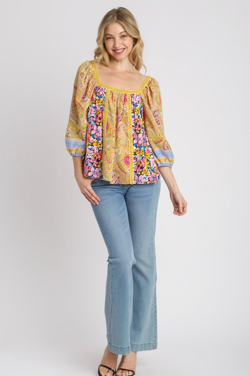 Our Mixed Print Balloon Sleeve Top has a wonderful mix of happy colors and joyful prints.